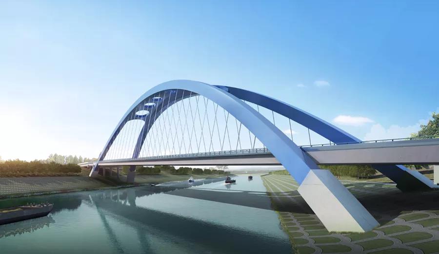 引江濟淮工程合銅黃高速公路橋,橋位位于安徽省合肥市廬江縣。全橋鋼結構重量為7746噸,是安徽省水利“一號工程”,為地標性高速公路橋。主橋采用鋼箱提籃拱橋一跨跨越引江濟淮工程水域。橋面采用首輪全匹配,其他輪次采用左右側主梁匹配制造,橫梁做成標準段發現場安裝,橫梁中間預留焊接環縫并加放補償量用于現場調節用;拱肋采用48米超高支架架設的安裝工藝。對全橋整體制造的線形控制精度要求極高。