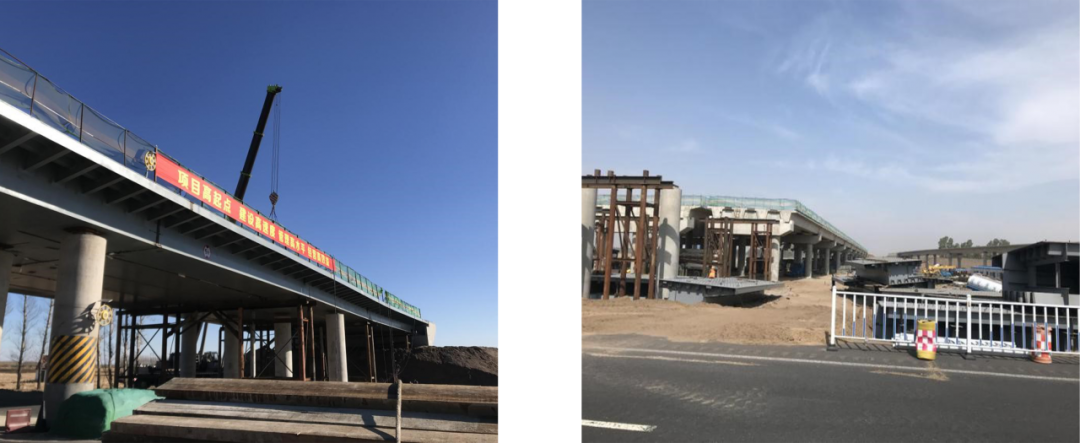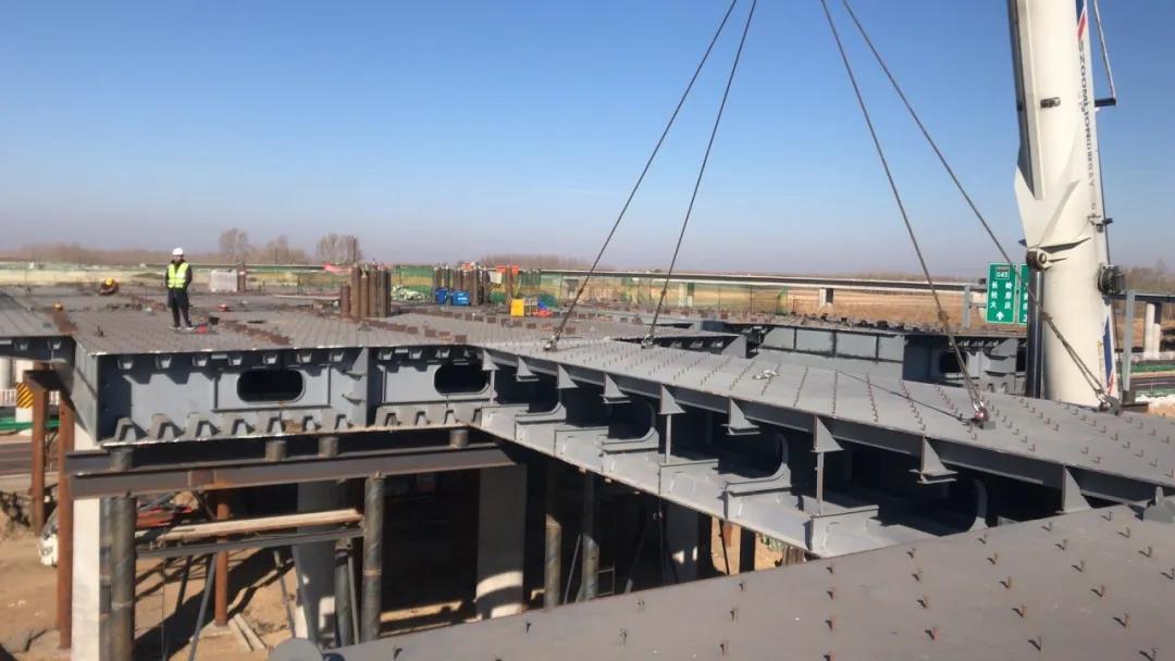2018年10月,該項(xiàng)目順利完成了鋼箱梁首吊工作,其中敖卜互通均橫跨長深高速,協(xié)力互通XC匝道橫跨大廣高速,施工過程中既需保證高速半幅通車,還需保證過往車輛、施工人員的安全,施工難度極大,同時(shí)各聯(lián)段按照既定計(jì)劃實(shí)施存在較多變數(shù),工期保證難度極大。為保證項(xiàng)目順利完成,在海波重科現(xiàn)場(chǎng)負(fù)責(zé)人胡劍濤帶領(lǐng)下,克服種種困難,與甲方密切配合,制定合理的、切實(shí)可行的聯(lián)段安裝計(jì)劃和可行的交通疏導(dǎo)方案,以保證長深高速、大廣高速車流順暢,同時(shí)做好安全防護(hù)工作;合理安排梁段安裝順序,選擇最優(yōu)的吊車占位地點(diǎn),提高安全性、減小安裝難度。