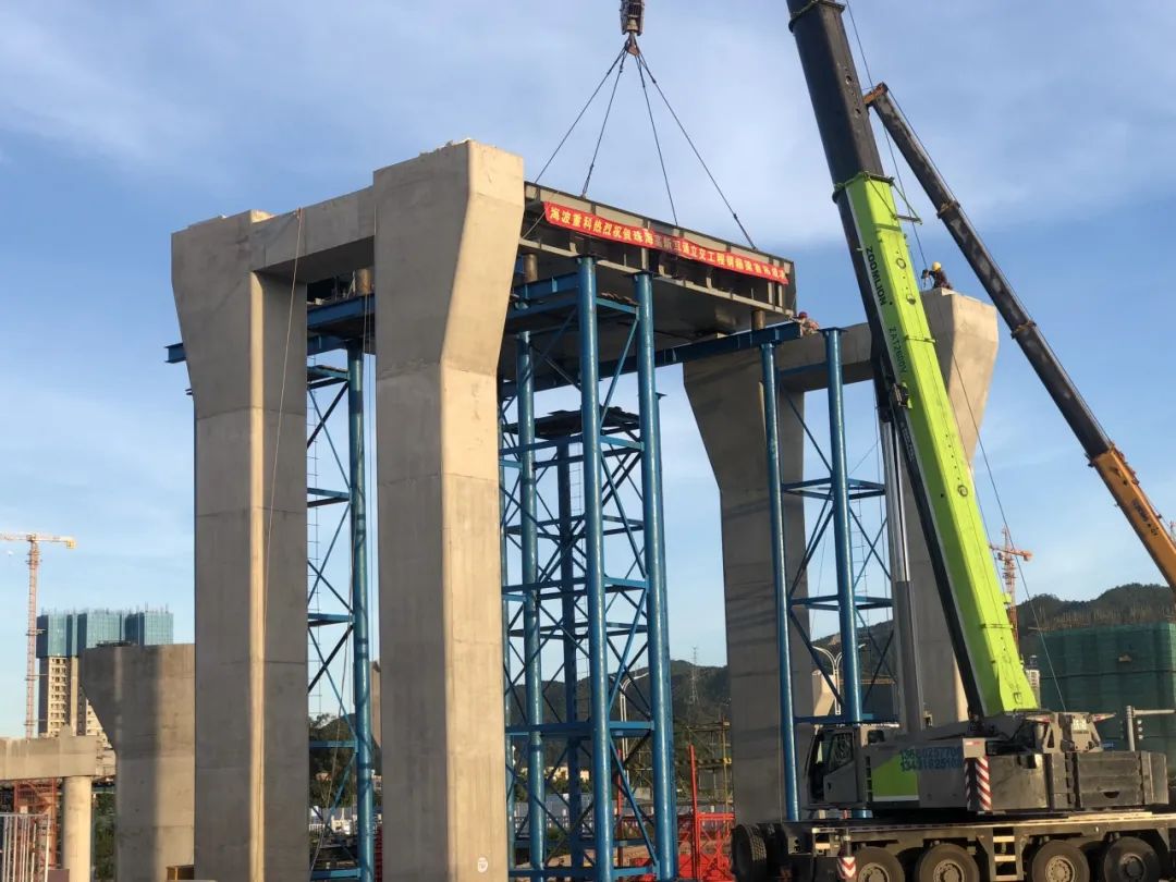 據(jù)海波重科項目負責(zé)人介紹,鋼箱梁部分節(jié)段上跨港灣大道,港灣大道為珠海市高新區(qū)主要道路,車流量巨大,箱梁節(jié)段拼裝、吊裝要求高,施工難度較大,為減小鋼箱梁吊裝對現(xiàn)有地面道路通行的影響,保障車輛正常通行,項目技術(shù)人員合理設(shè)計了梁段安裝順序,并在鋼箱梁施工時,采取半封道(單邊雙向車道)、半施工措施,做好交通導(dǎo)流措施,提前分流,減少交通壓力;選擇夜間車流量較少時段施工,保證雙向往返車輛通行安全。
