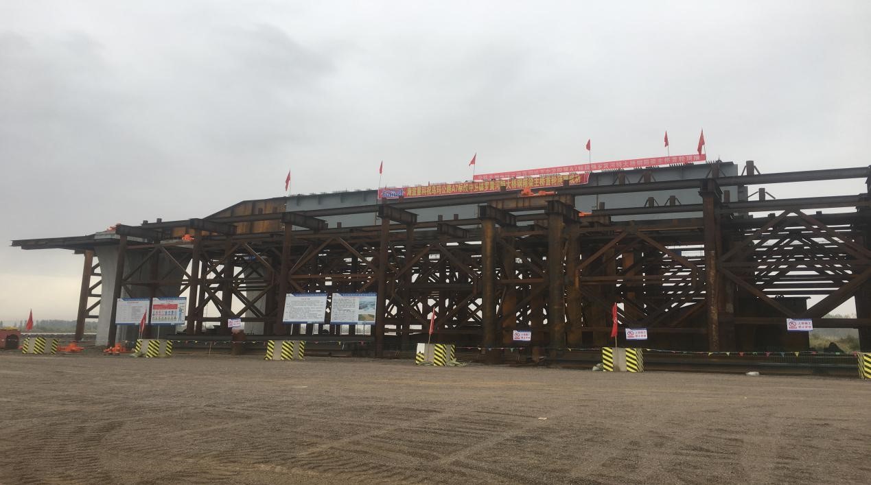 烏海至瑪沁公路(寧夏境)青銅峽至中衛段是國家和寧夏自治區“十三五”規劃內的重點公路項目,其主要功能是寧夏高速公路規劃網“三環九射八聯”中中衛市環線的最重要組成部分,也是服務于中衛市城鄉經濟發展的最主要支撐。我司承建的A7標鎮羅黃河特大橋工程位于中衛市黃河下游15km處的鎮羅鎮,分為主線橋,南岸跨堤橋,北岸跨堤橋,南岸引橋,北岸引橋共5聯。起點樁號LK5+684,終點樁號LK6+964,全長1289m。該橋設計荷載等級為公路-I級,橋梁全長1289m,橋寬26m;橋梁基礎采用樁基礎,最大樁長75m,墩柱為矩形實心片墩,最大墩高17.37m。黃河大橋主線橋跨徑布置為55+6×90+55=650m,樁號范圍為LK5+999~LK6+649,結構形式為單箱單室組合梁連續梁橋,分幅布置,采用頂推法施工。