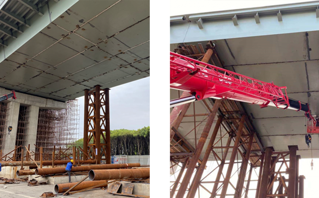 項目主線第四聯設計為三跨等高連續鋼箱梁頂推施工,是整個項目中施工難度和施工風險最大的部位,做好施工過程中的安全防護以及蘇臺高速的交通組織是施工的重難點。其原先設計采用由北向南頂推過高速,由于鋼箱梁位于整個高架橋第四聯,處于上坡段,橋梁縱坡達到了4%,整個頂推部分鋼箱梁重量達到1000噸,按原設計方案頂推由北向南,施工難度較大,安全風險高,參建各方集思廣益,不斷優化施工組織設計,將施工方案優化為由南向北水平頂推,一次頂推到位,減少地面道路交通導改影響,方案經多方論證得以順利實施。