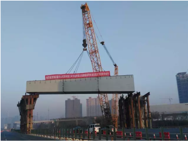 ? ? ? 鄭州南三環(huán)東延工程(南臺路-經(jīng)開第五大街)第二標段Z22聯(lián)鋼箱梁,總長度165m,中跨跨度75m,全聯(lián)鋼箱梁總重量3100余噸,鋼箱梁梁高為變高度,最大梁高3.8m,該聯(lián)鋼箱梁上跨機場高速公路,高速公路上車流不斷,同時下穿金機線和金李線兩條高壓線,高壓線距離鋼箱梁橋面僅為17m,該項目經(jīng)過多方專家論證,最終采用大節(jié)段拼裝后吊裝的施工工藝,克服了高速公路上不能設(shè)置臨時支架的難點。單個最大鋼箱梁吊裝節(jié)段重量達162噸,為克服上跨高速公路和下穿高壓線的難點,現(xiàn)場采用額定起重量為450噸的大型履帶吊進行吊裝。